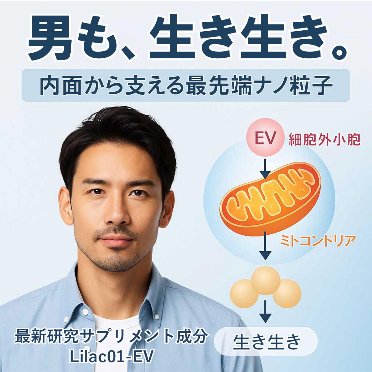 EVは、体内でも使われているナノサイズの物質で、研究者の間で注目されています。 Lilac01-EVは、乳酸菌由来で自然の素材。