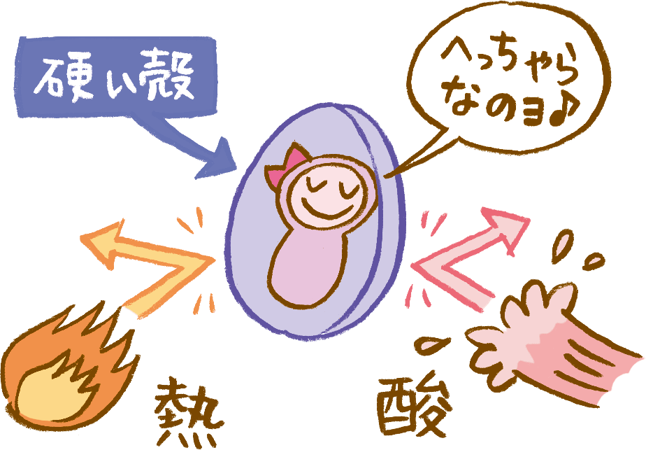 ライラックの花から採取された特別な乳酸菌で、「有胞子性乳酸菌」というタイプに分類されます。芽胞という“守られたカプセル”のような形で、胃や腸の過酷な環境を乗り越えて、腸の奥までしっかり届きます。